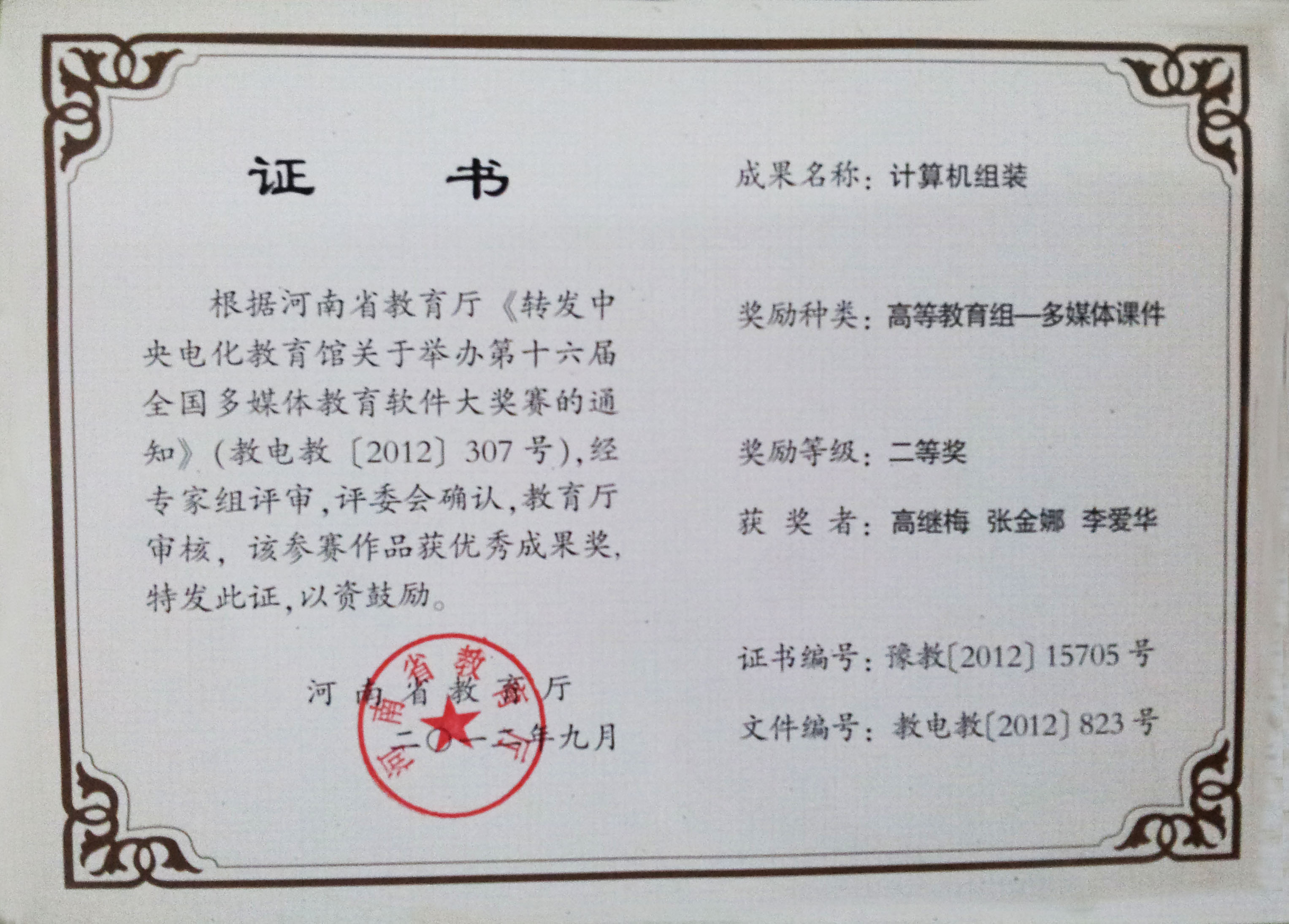 本课件参加河南省第十六届多媒体教育软件大奖赛,获得高等教育组二等奖。内容是计算机组装,课件采用螺旋式递进结构,通过文字、视频、互联网来展现计算机组装过程,让员工观看以后能对计算机组装有一个全面的认识。课件共分为三个部分:计算机系统构成、组装视频和实战演练。系统构成部分主要通过图片和文字来解说计算机的组成元件;组装视频展现的是计算机组装的动态过程,并要求员工写出观看后的心得及组装注意事项;实战演练部分是布置相关练习题来进一步巩固同学们所学习的知识。