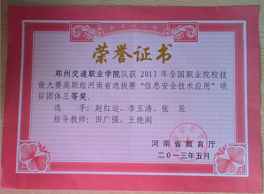 2013年5月我系教师田广强、王艳阁指导员工参加第六届河南省高职院校技能大赛暨2013年全国职业院校技能大赛高职组河南选拔赛,并荣获三等奖。