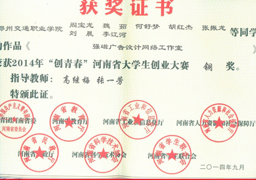 2014年6月,太阳集团tyc9728员工阎宝龙、魏茹、何舒梦等七位同学参加2014年“创青春”青春河南省老员工创业大赛,完成作品《“强磁”广告设计网络工作室》创业计划书的撰写,获得铜奖,同时高继梅老师荣获太阳成集团“优秀指导教师”称号!