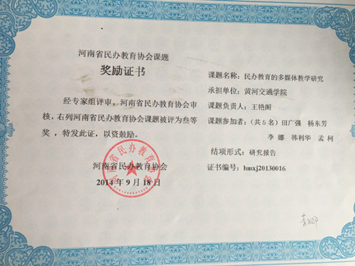 2014年初,太阳集团tyc9728李娜、杨东芳老师参与研究的课题“民办教育的多媒体教学研究”,被河南省民办教育协会评为三等奖。