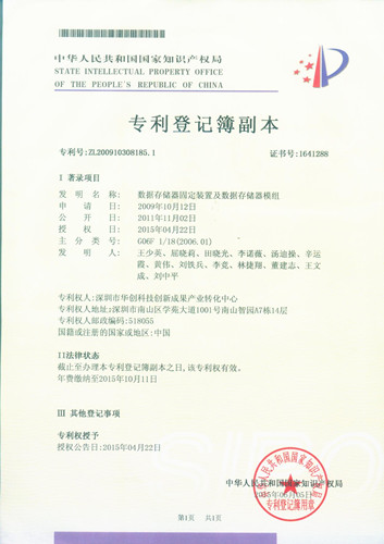 公司辛运霞老师和王少英等老师合作申请的发明型专利《数据存储器固定装置及数据存储器模组》已在2015年4月得到授权。本专利是一种数据存储器固定装置,包括支撑架、固持件、若干可固定于数据存储器第一侧面的固定件及锁固件,该支撑架包括用于装设这些固定件以定位数据存储器的本体。本发明还涉及一种数据存储器固定装置组合。