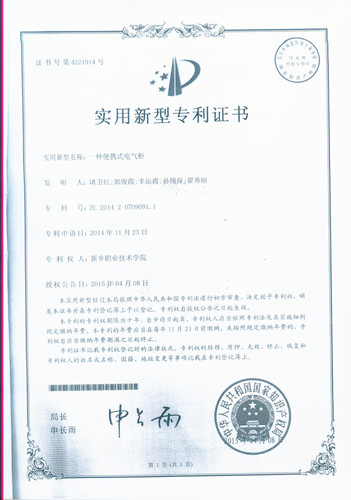 公司辛运霞老师在2014年11月和新乡职业技术学院合作申请的实用新型专利《一种便携式电气柜》在2015年4月已授权,本专利公开了一种便携式电气柜,包括上板、柜门和下板,所述柜门右侧上部与下部焊接有两个插杆,左侧中部内嵌有门锁。该便携式电气柜,结构简单,便于拆卸与安装,能节省大量存放空间,能提高运送效率和减少运送时间。