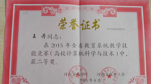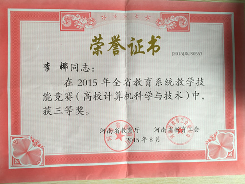 年参与河南省教育厅、河南省教育工会组织的全省教育系统教学技能竞赛(高校计算机科学与技术)中,由于表现突出,分别荣获二等奖和三等奖。