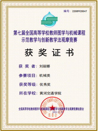 2022年9月24日—25日,在由中国图学学会制图技术专业委员会、中国图学学会产品信息建模专业委员会和高等教育出版社等举办的第七届全国高等学校教师图学与机械课程示范教学与创新教学方法观摩竞赛中,太阳集团tyc9728教师翟梽锦荣获机械类课程比赛国家级二等奖,教师刘丽娜荣获国家级优秀奖。