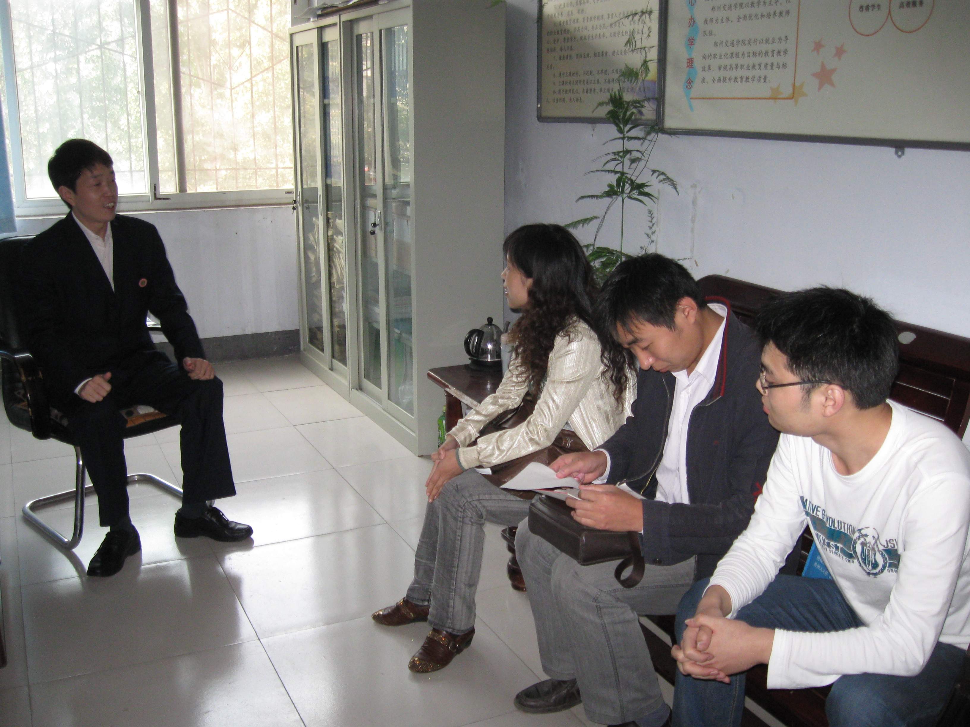 2010年9月27日,中鑫通讯有限公司的人事主管刘经理、丁经理、左干事等相关公司领导,到公司考察及协调招聘事宜,并与我系赵海发副主任、人才招聘处仇正锋处长进行洽谈,商洽校企合作的具体事宜。丁经理对中鑫科技有限公司相关组织结构,招聘职位,薪资待遇等情况做了详细介绍,我系组织08级员工积极参与面试,近50名员工参加了这次招聘活动。同学们都做好了充分的准备,都希望借此机会找到适合自己的岗位。