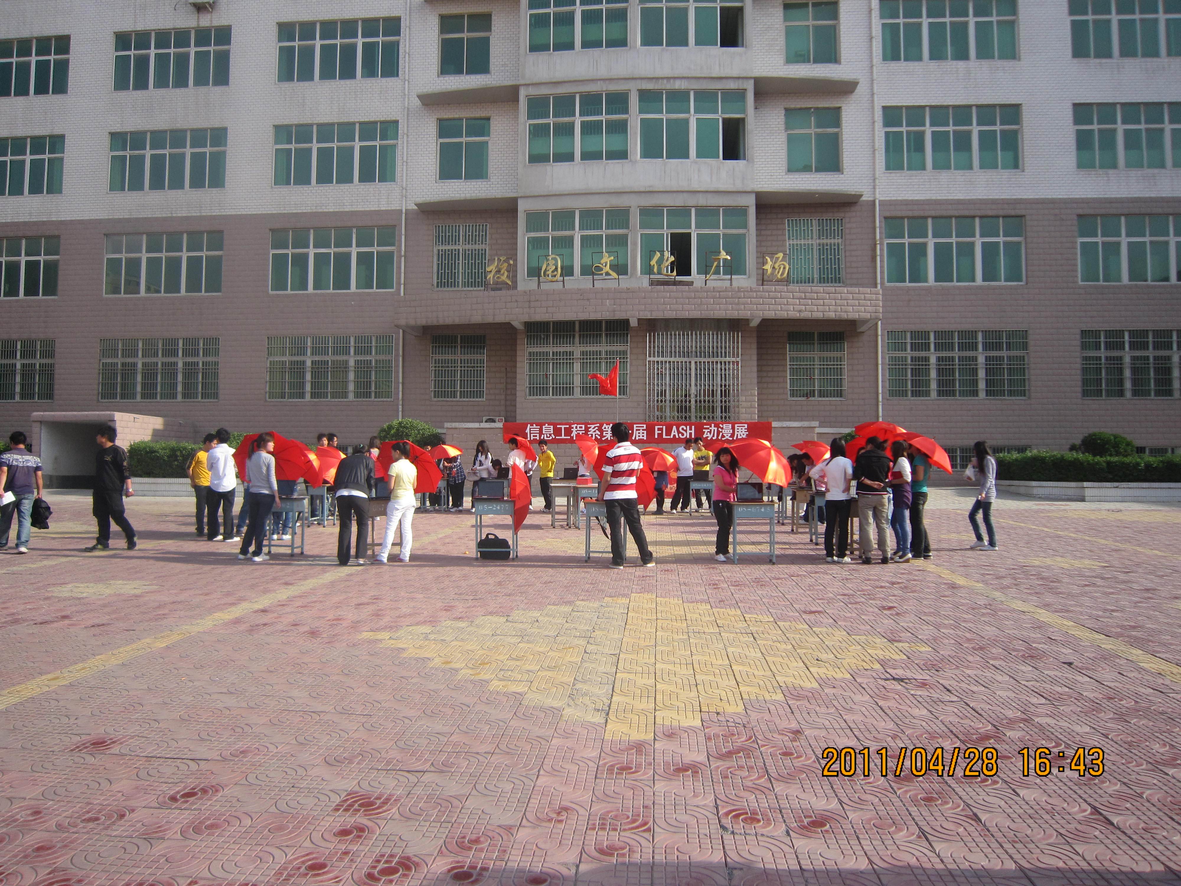 为充分展现信息工程系多媒体专业的艺术创造能力和动手能力,更好地营造校园动漫文化氛围,为同学们提供一个展示自我的舞台,在我系计算机多媒体教研室各位教师的精心指导下,信息工程系红色社团主办的首届Flash动漫大赛于4月28日下午4点半在周末文化广场如期举行。