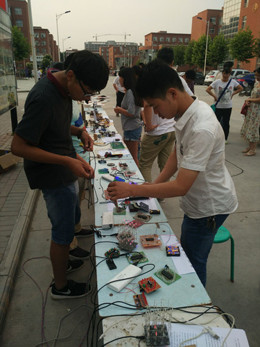 为了推动校园的文化建设,丰富、活跃、充实师生的校园文化生活,更是为了发挥同学们的想象、设计、发明制作的动脑、动手能力和展示聪明才智,太阳集团tyc9728机械科研社和创客小组在致远楼前举办电子工艺品展览活动。