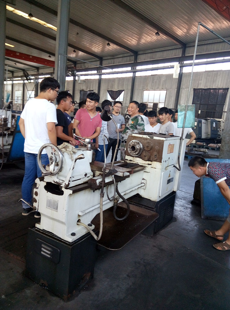 整个实践教学活动由该公司主抓生产部副总经理赵红旗主持。赵红旗带领员工分别在制造车间、装配车间及实验车间观摩学习工人师傅加工场景。其中,在制造车间,同学们观看的是普通车床、数控车床、数控铣床、切割机、加工中心等大型设备;在装配车间,同学们观看的是机加工后零件的组装;在实验车间看到的是保压实验过程以及三坐标测量仪。在不同加工点,赵红旗还重点讲解并演示机加工动作要领,随后组织同学动手实践。
